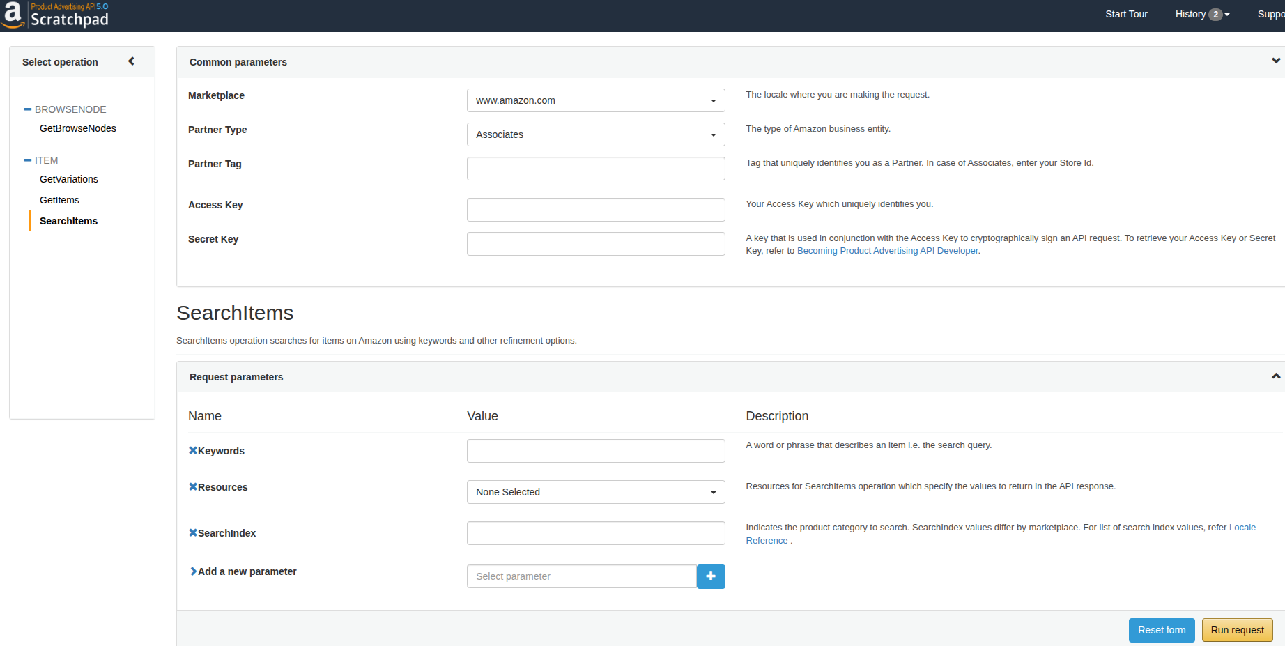 First, navigate to the Amazon PA-API 5.0 Scratchpad.